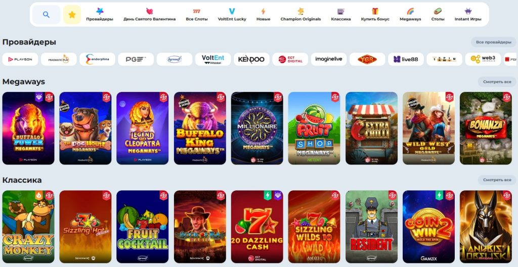 Игровой каталог Champion Casino насчитывает более 3 000 наименований и охватывает все популярные жанры. Для каждой игры доступен демо-режим — это позволяет изучить механику без риска. Удобные фильтры и строка поиска помогают быстро найти нужный слот среди тысяч вариантов.